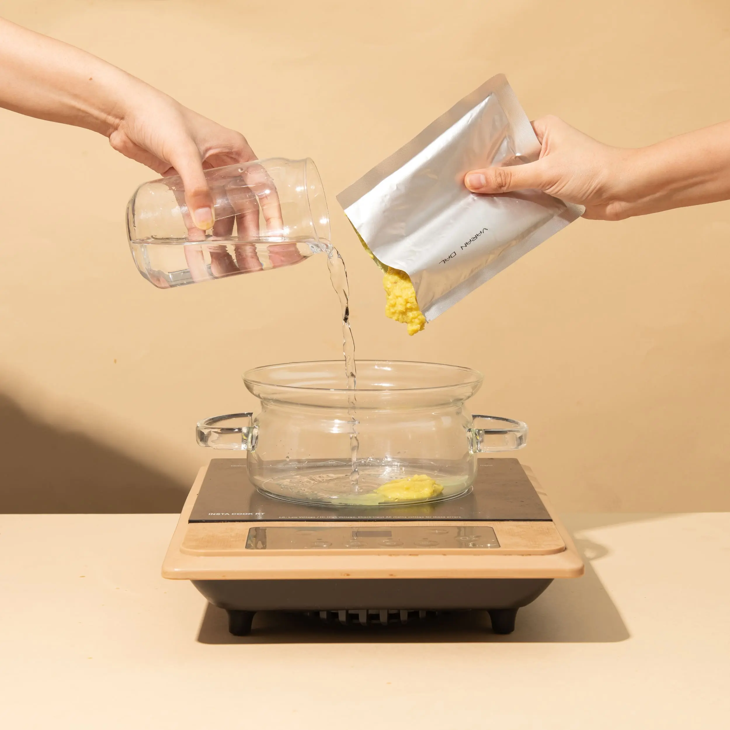 In a pot, add the entire contents of the pouch, add 200ml of water and stir well until combined.